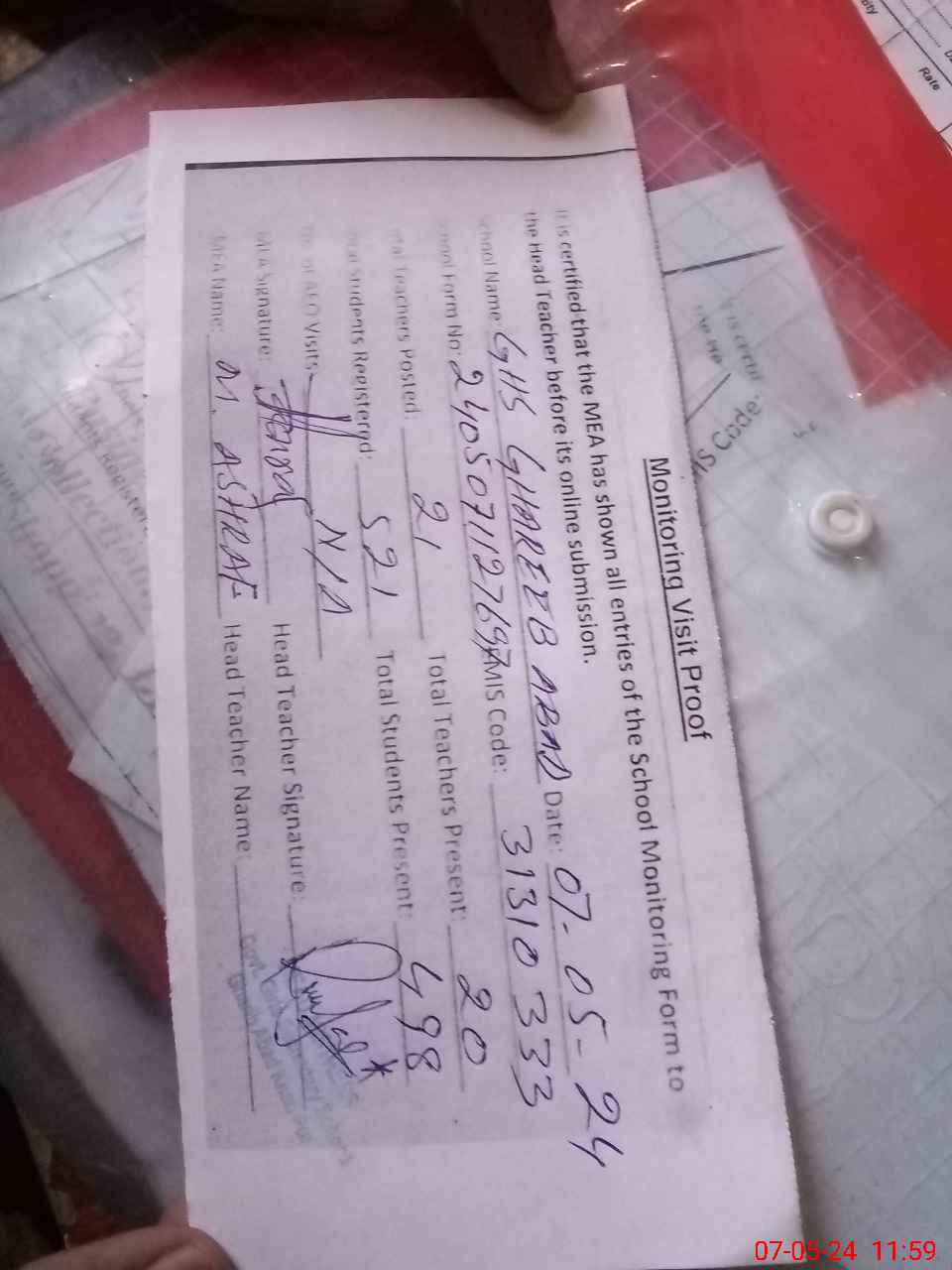 | Attendance Register | Head Teacher | MEA with School | Visit Proof |
