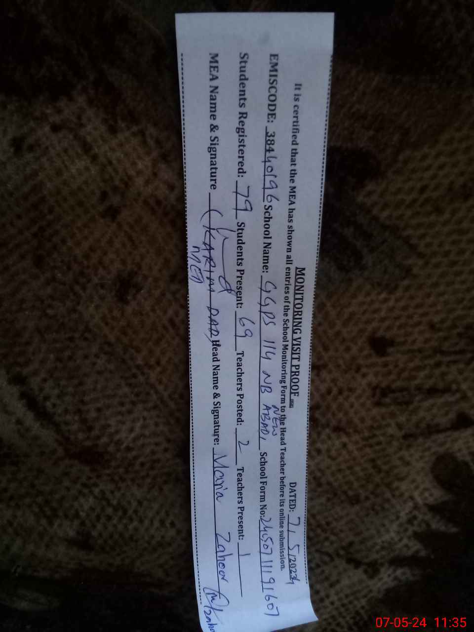 | Certified that this School was Inspected by the Undersigned MEA/DMO Today and the Information Stated Above is as Per Record. | |||||