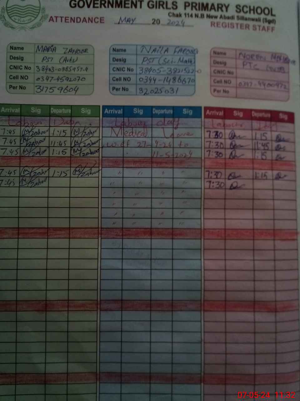 | CNIC | Full Name | Designation | R/C | Absence During Last Calender Month |