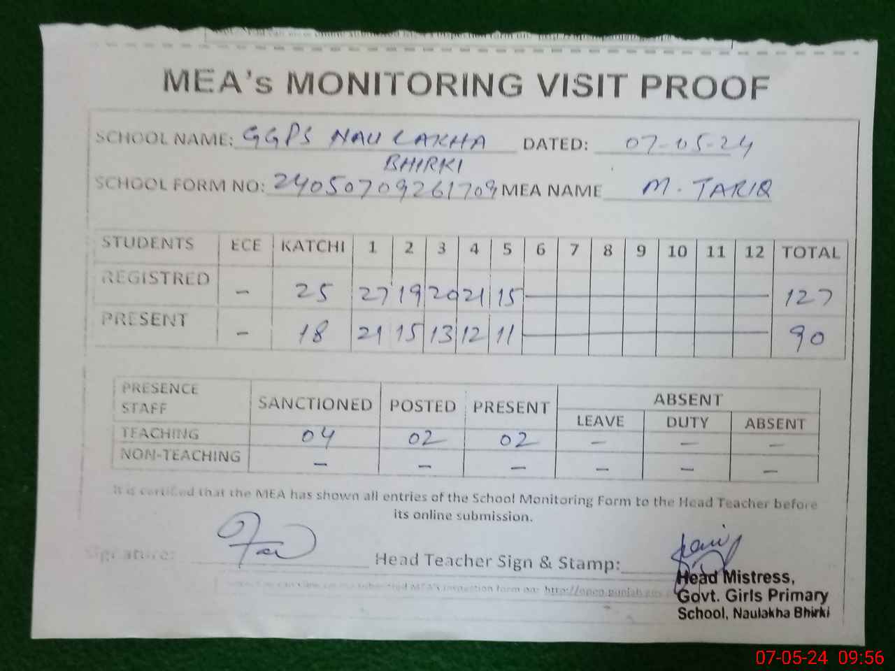 | Attendance Register | Head Teacher | MEA with School | Visit Proof |