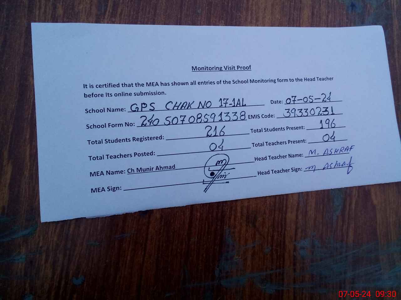 | EMIS Code: 39330231 | Name of School: GPS CHAK 17/1-AL | |||