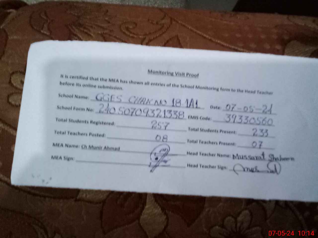 | Certified that this School was Inspected by the Undersigned MEA/DMO Today and the Information Stated Above is as Per Record. | |||||