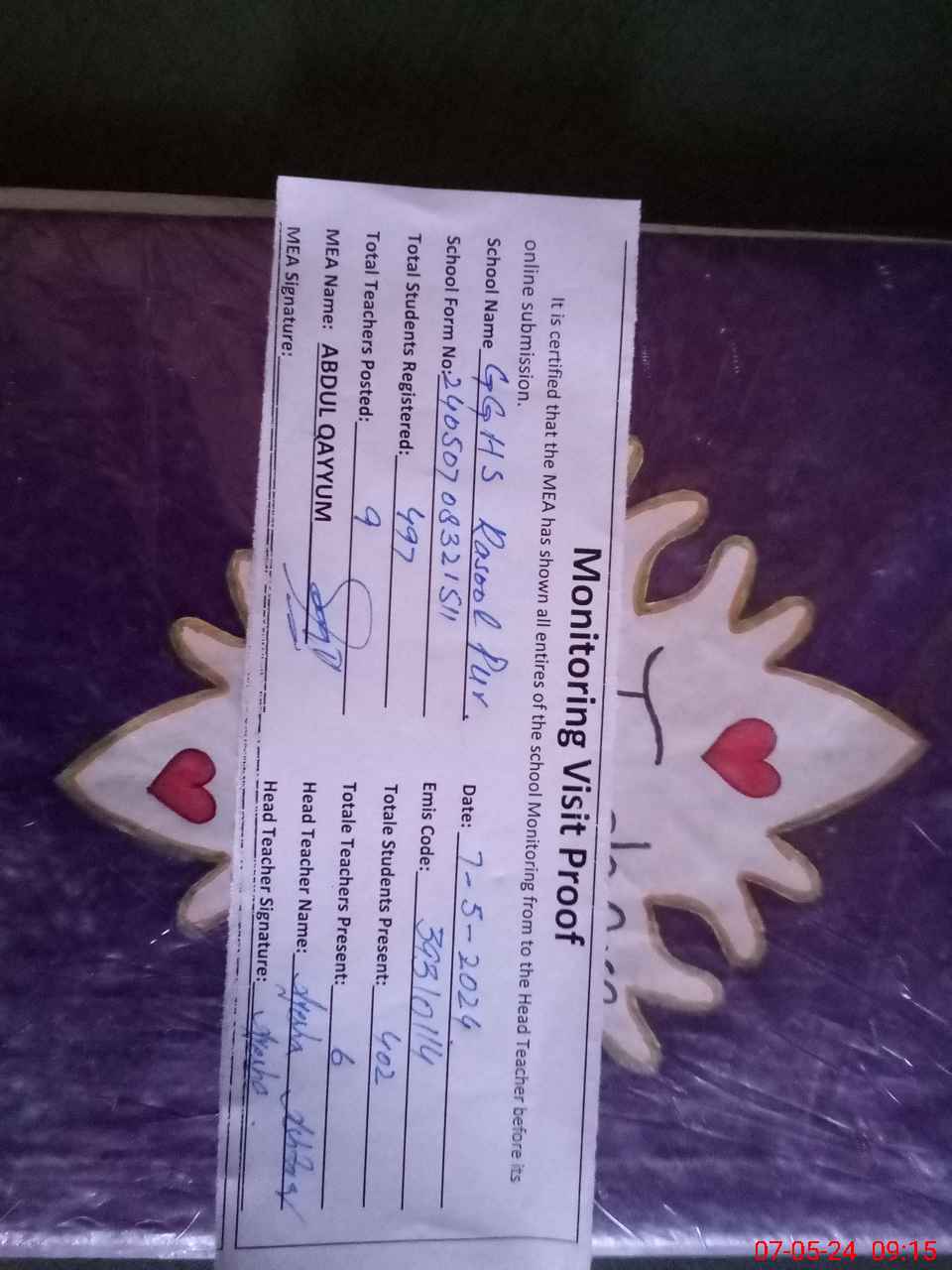 | EMIS Code: 39310114 | Name of School: GGHS RASOOL PUR | |||