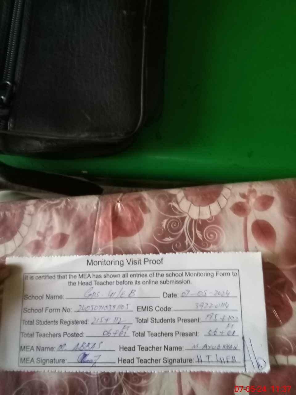 | Certified that this School was Inspected by the Undersigned MEA/DMO Today and the Information Stated Above is as Per Record. | |||||