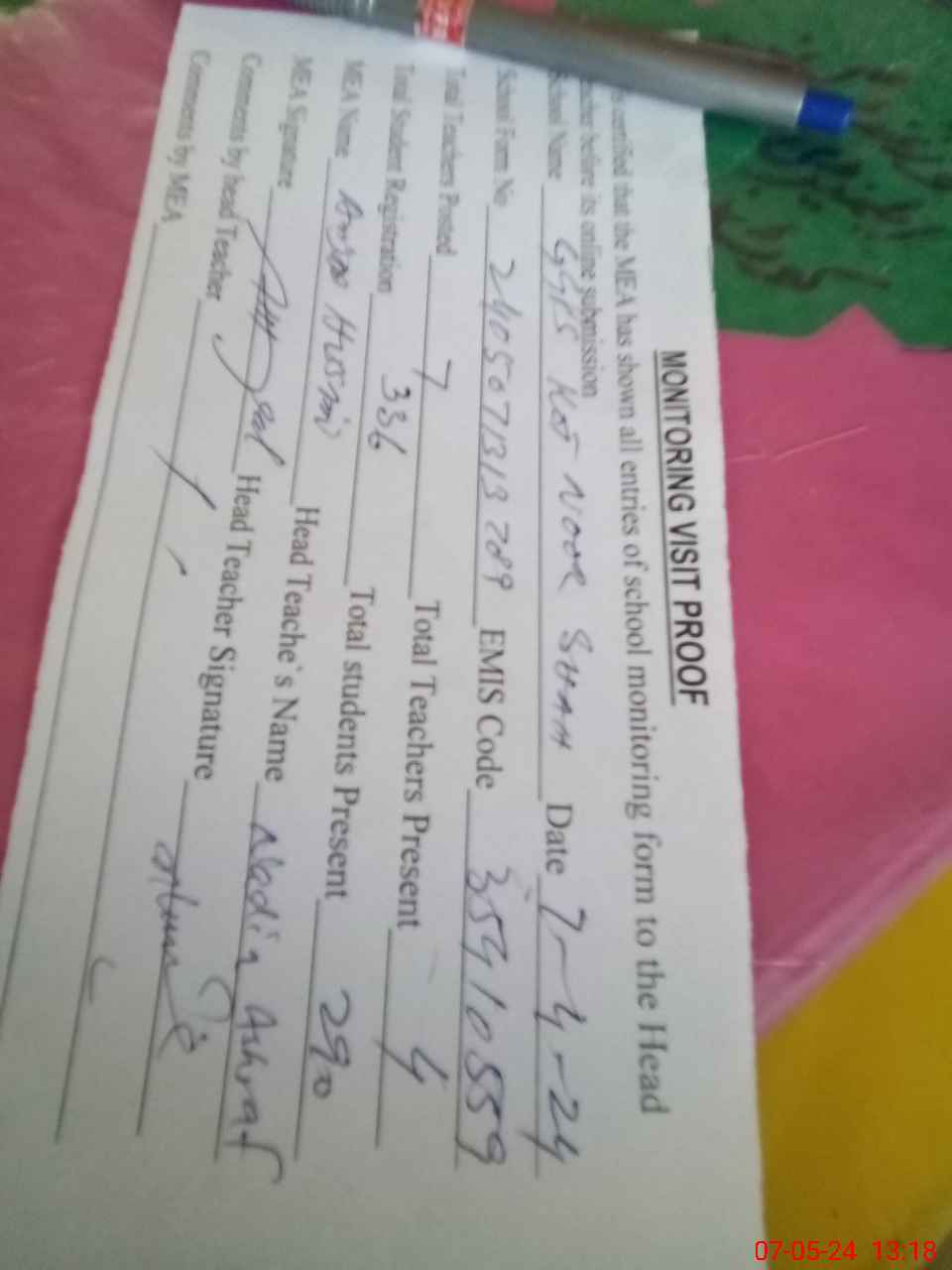 | Attendance Register | Head Teacher | MEA with School | Visit Proof |