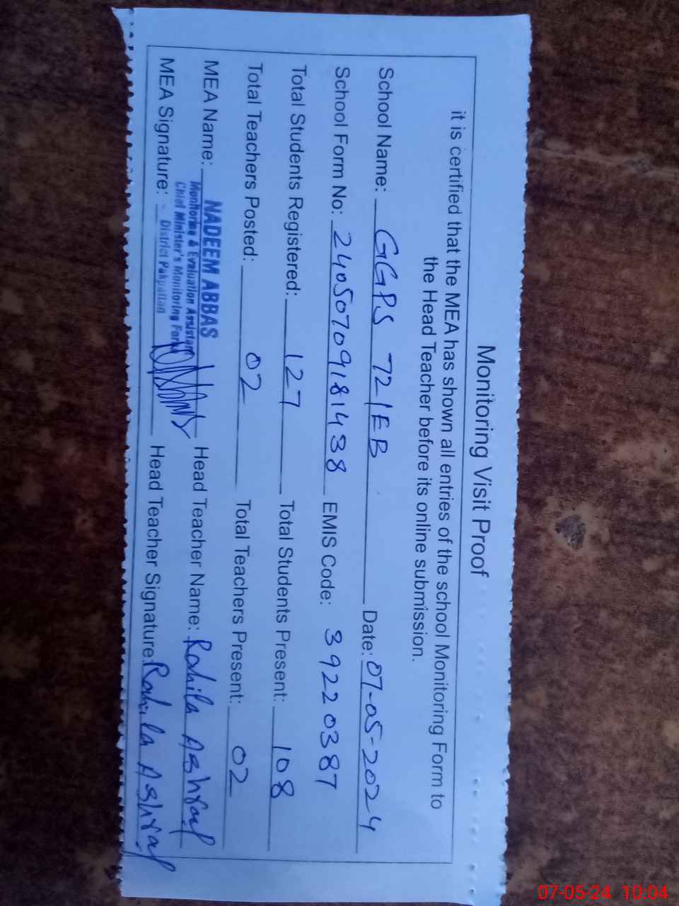 | EMIS Code: 39220387 | Name of School: GGPS 72 EB MUHAMMAD NAGAR ARIFWALA | |||