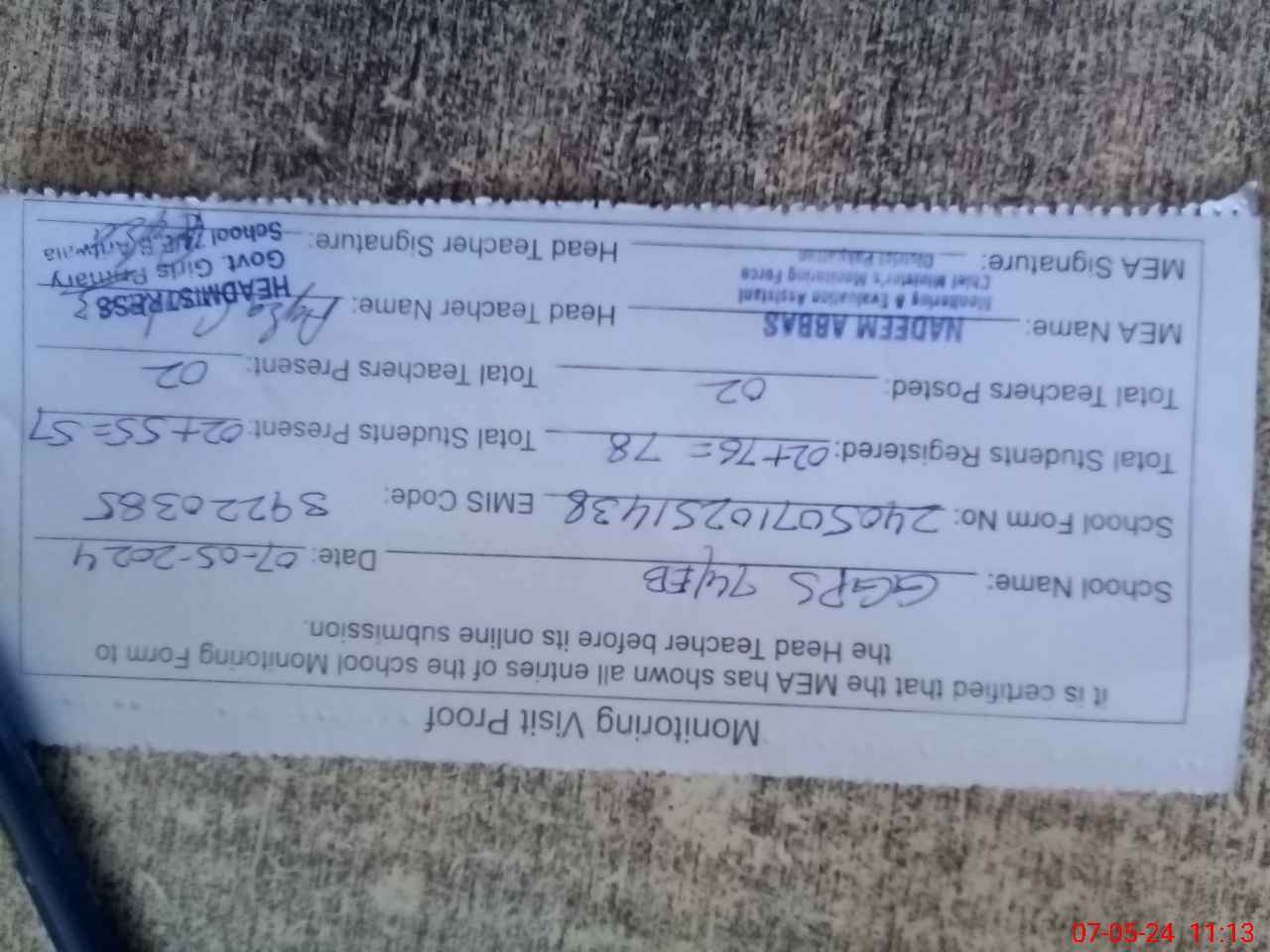 | Attendance Register | Head Teacher | MEA with School | Visit Proof |