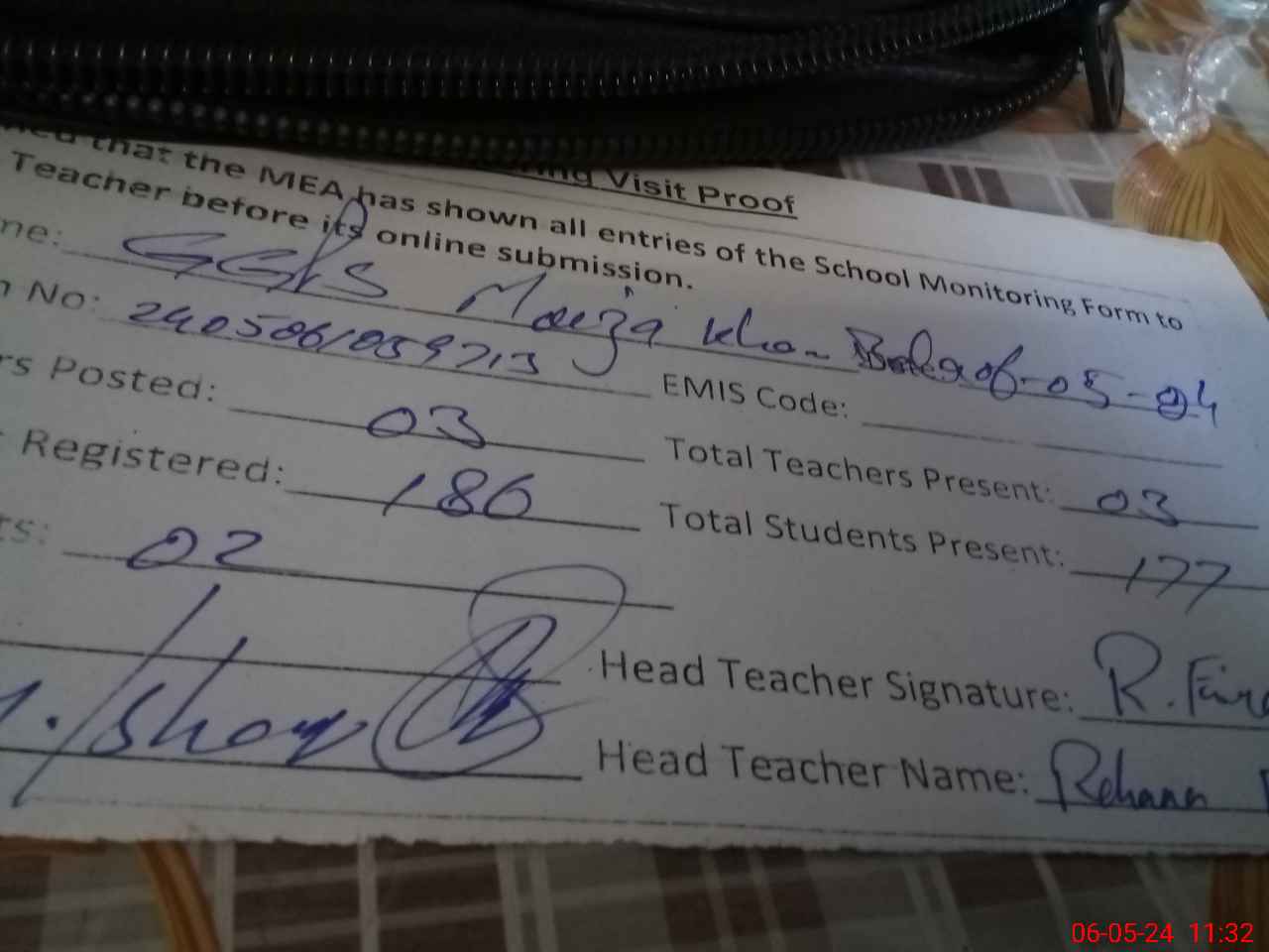 | Name: RE**** FE**** Designation: (School Headmaster's/Headmistress's) PST/PTC/JV Phone/Cell Number: 03**** |