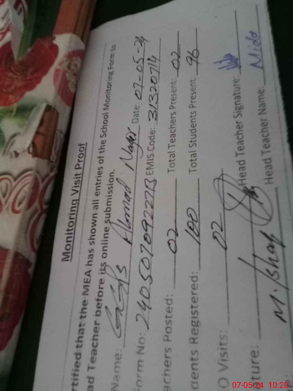 | Attendance Register | Head Teacher | MEA with School | Visit Proof |