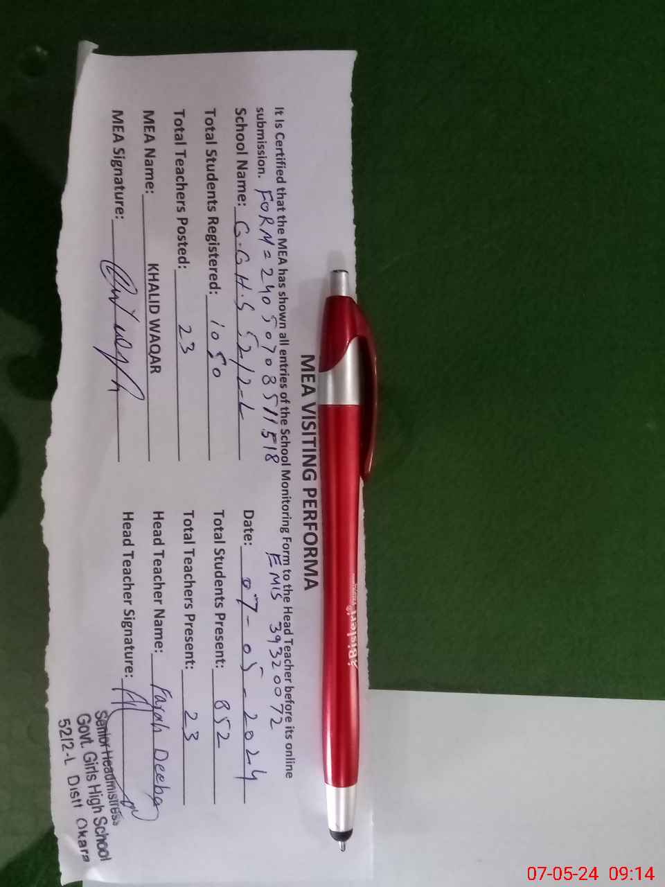| Certified that this School was Inspected by the Undersigned MEA/DMO Today and the Information Stated Above is as Per Record. | |||||