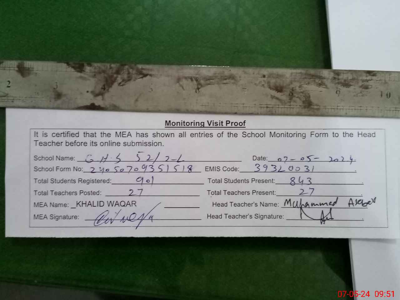 | Monitoring Date: 07-05-2024 | Start Time: 07-05-2024 09:29 AM | End Time: 07-05-2024 09:56 AM | Name of MEA: KH**** WA**** | |