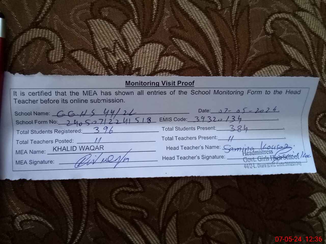 | Monitoring Date: 07-05-2024 | Start Time: 07-05-2024 12:18 PM | End Time: 07-05-2024 12:36 PM | Name of MEA: KH**** WA**** | |