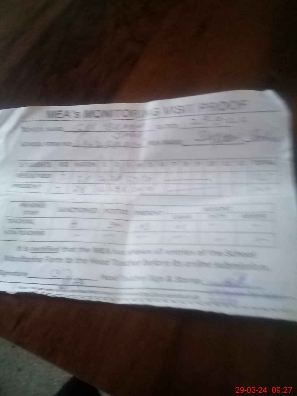 | Attendance Register | Head Teacher | MEA with School | Visit Proof |