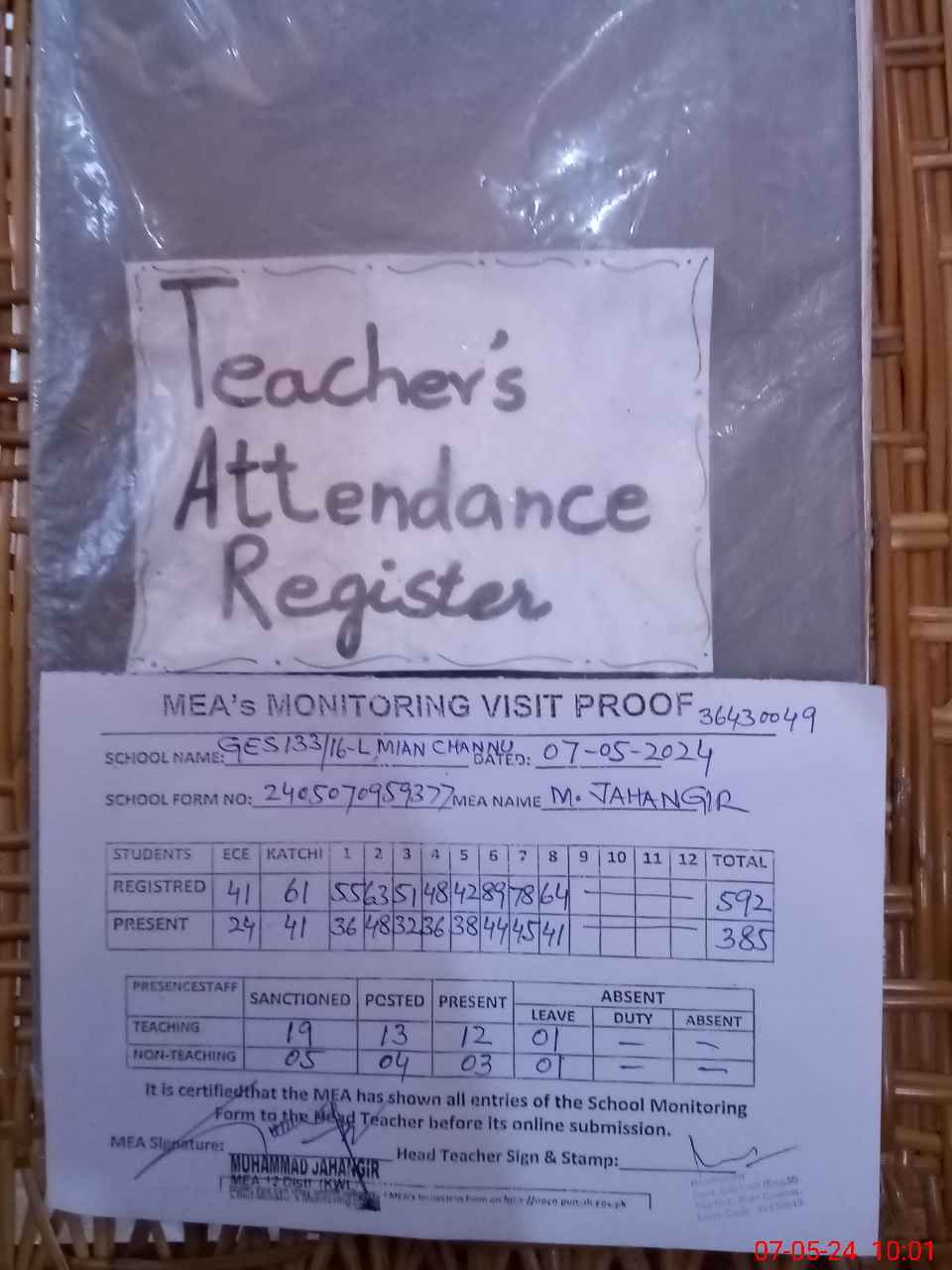 | Attendance Register | Head Teacher | MEA with School | Visit Proof |