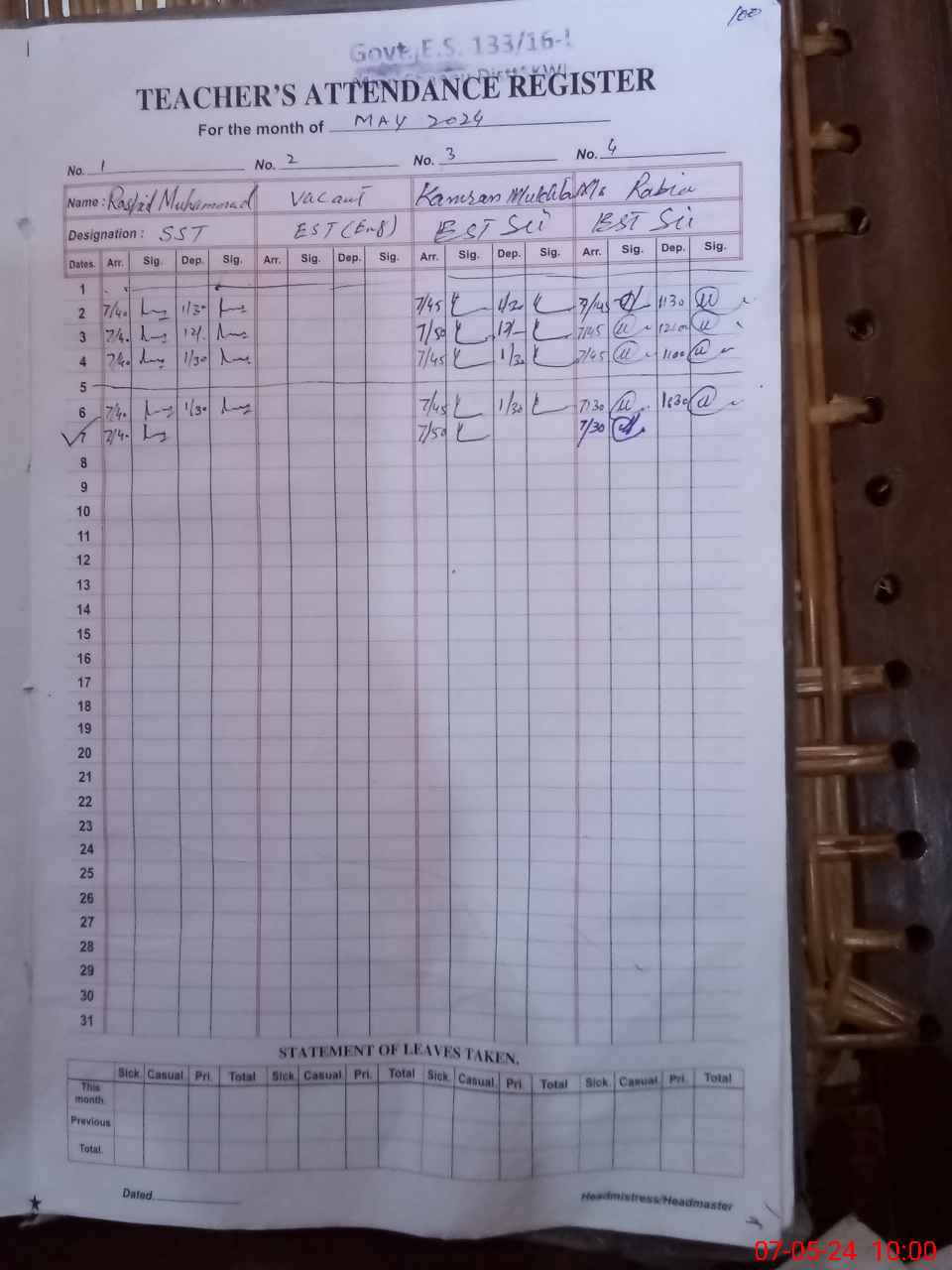 | CNIC | Full Name | Designation | R/C | Absence During Last Calender Month |