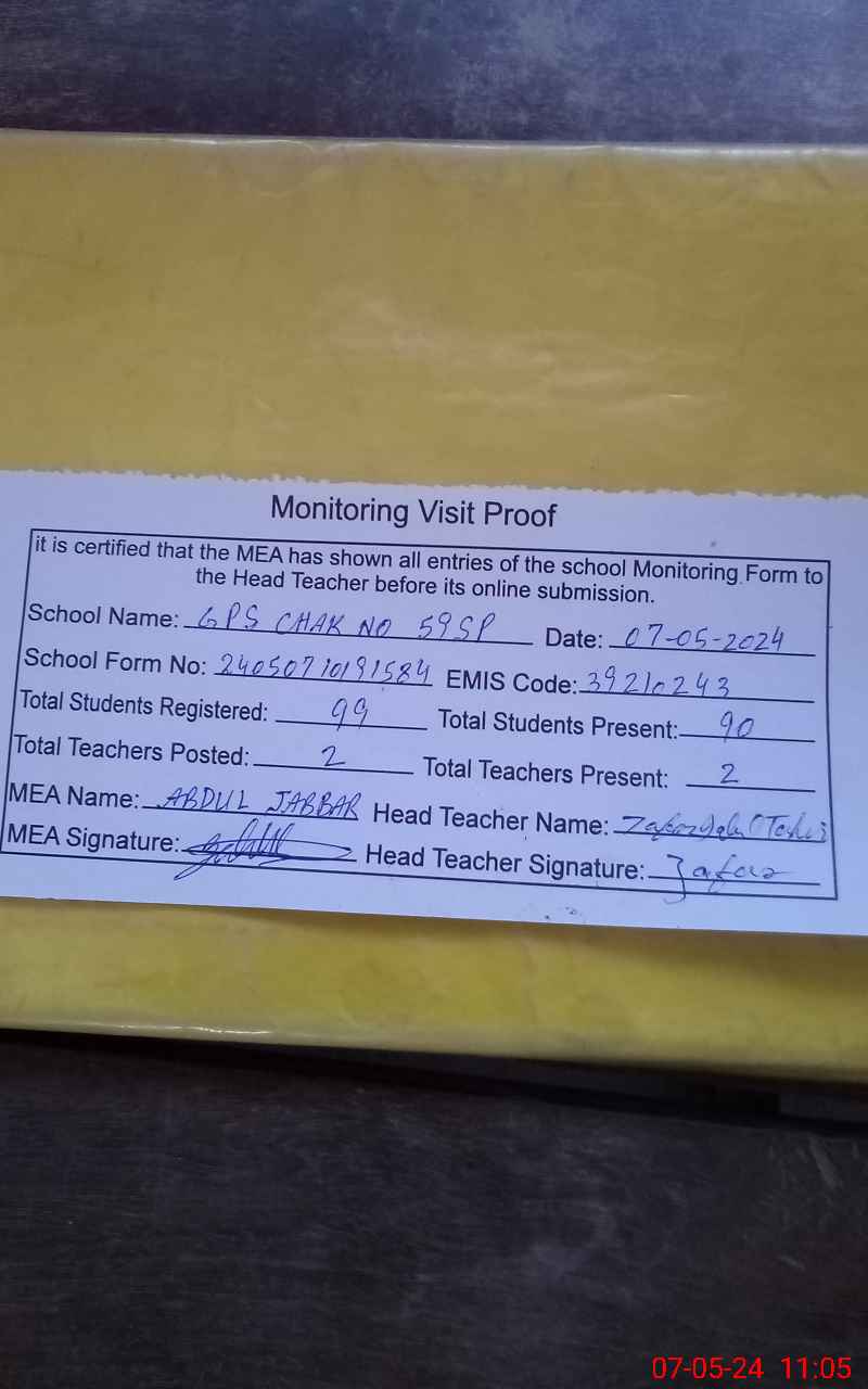 | EMIS Code: 39210243 | Name of School: GPS CHAK NO. 59 / SP | |||