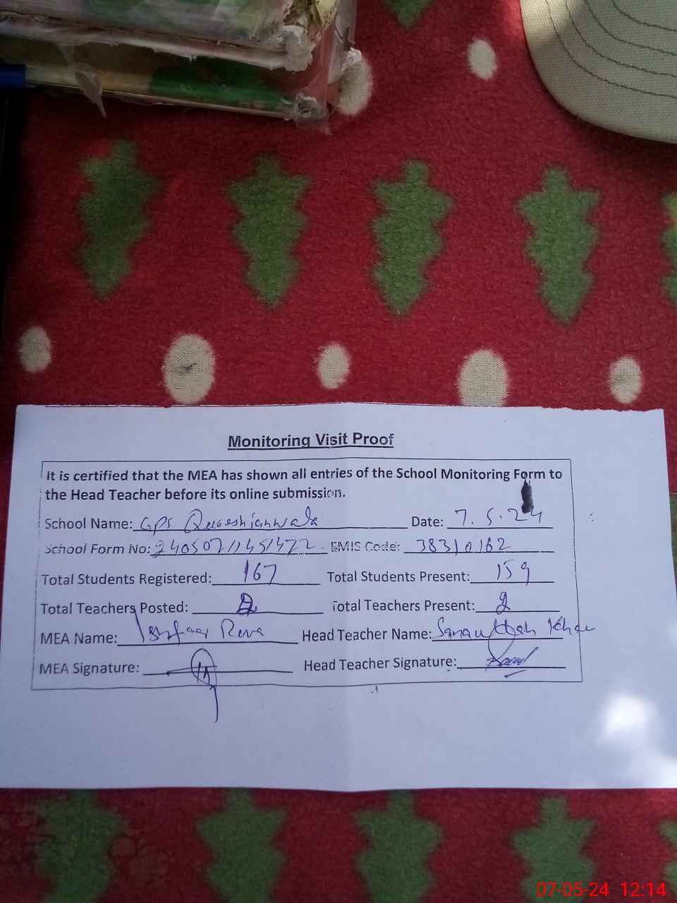 | Attendance Register | Head Teacher | MEA with School | Visit Proof |