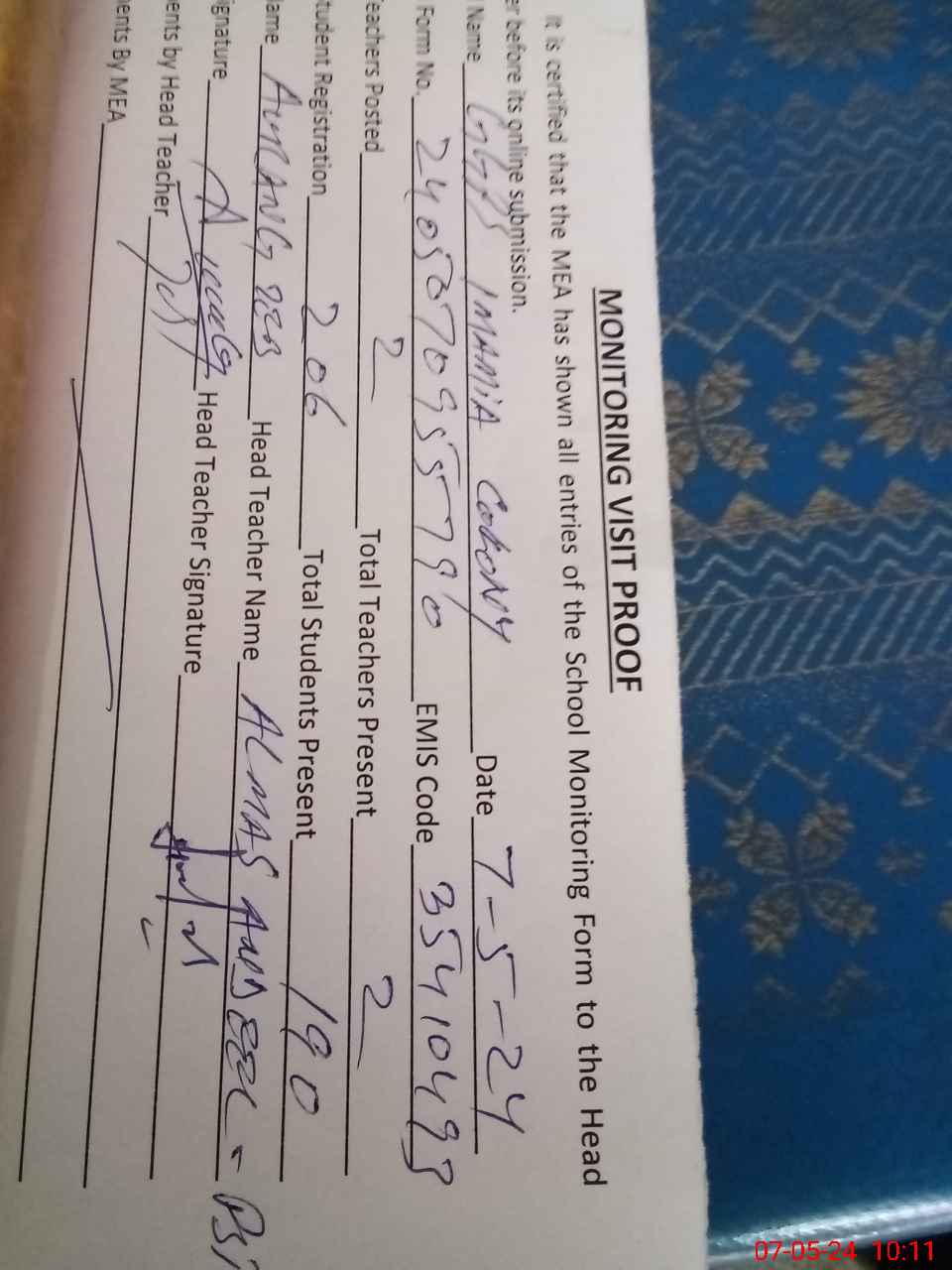 | Certified that this School was Inspected by the Undersigned MEA/DMO Today and the Information Stated Above is as Per Record. | |||||