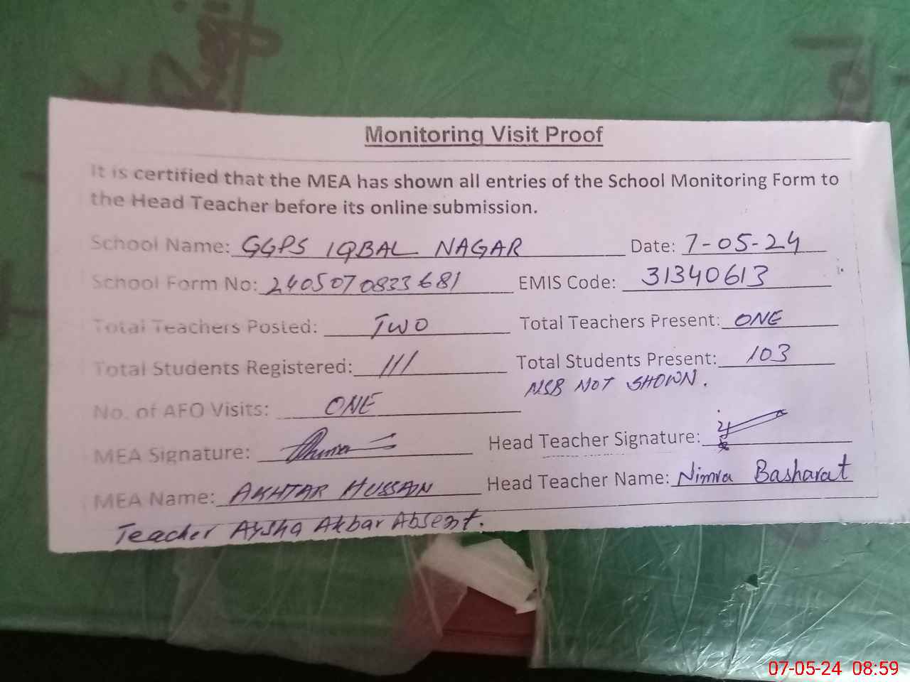 | EMIS Code: 31340613 | Name of School: GGPS IQBAL NAGAR | |||