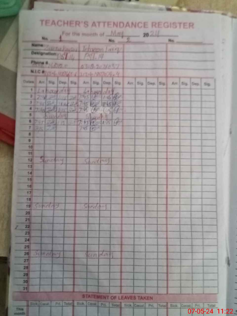 | CNIC | Full Name | Designation | R/C | Absence During Last Calender Month |
