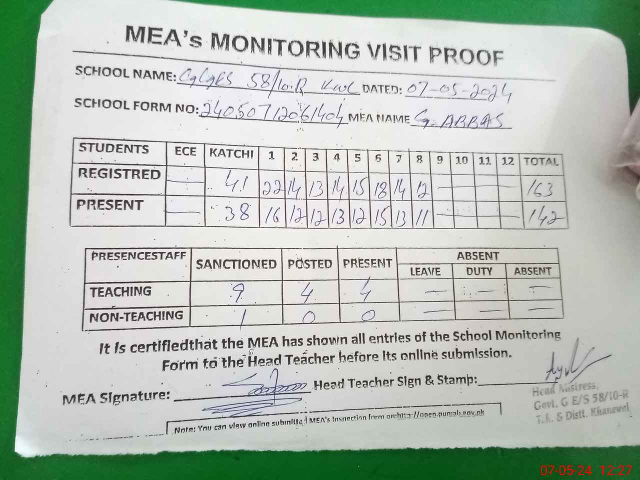 | Attendance Register | Head Teacher | MEA with School | Visit Proof |