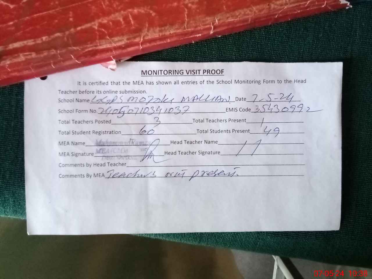 | Attendance Register | Head Teacher | MEA with School | Visit Proof |