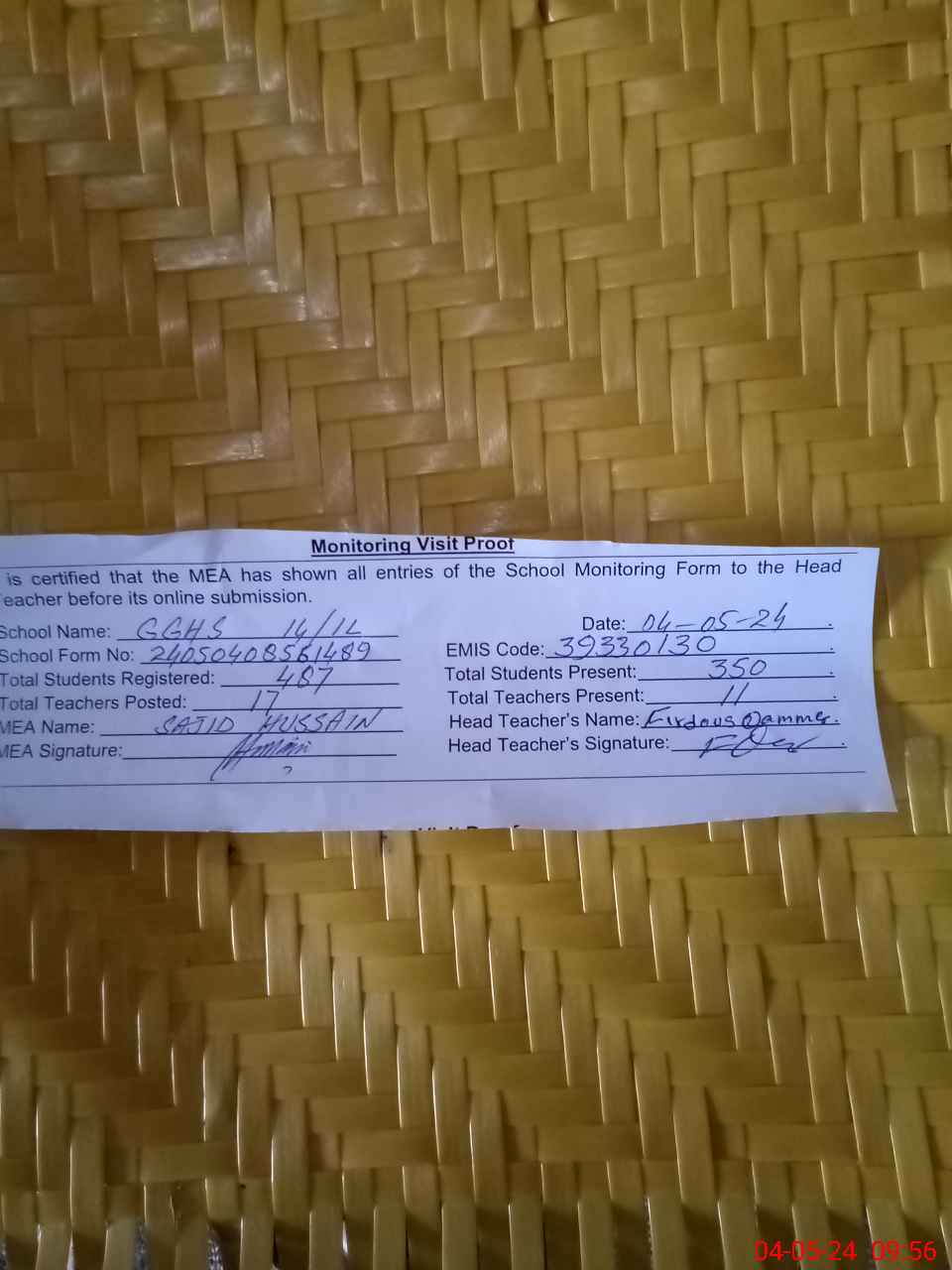| EMIS Code: 39330130 | Name of School: GGHS CHAK NO. 14/1-L | |||