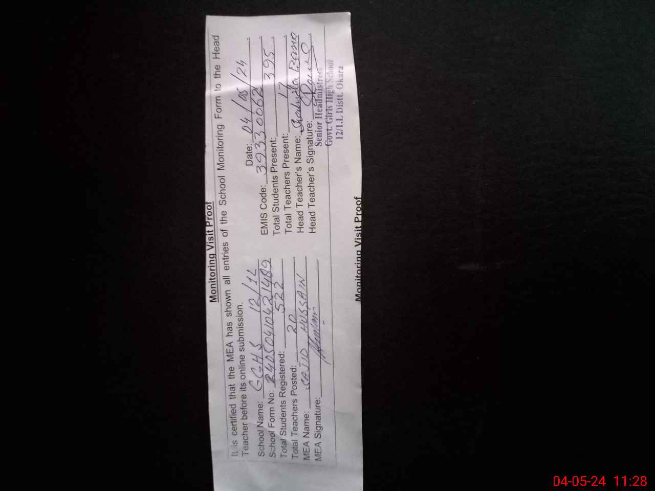 | EMIS Code: 39330062 | Name of School: GGHS CHAK NO.12/1-L | |||
