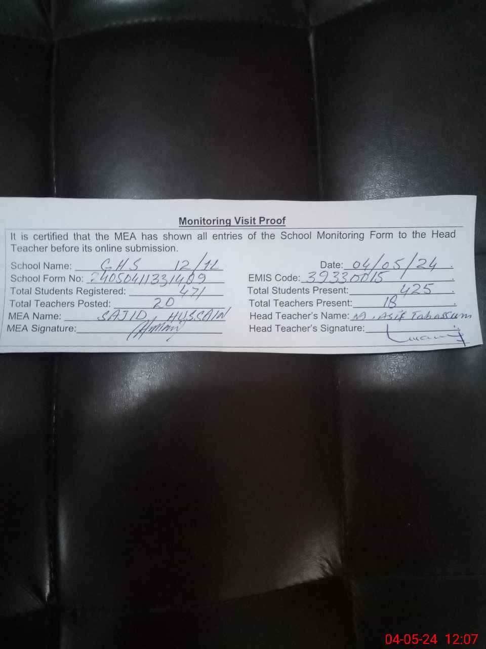 | Attendance Register | Head Teacher | MEA with School | Visit Proof |