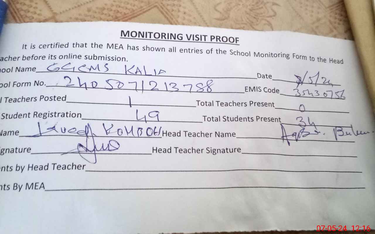 | Attendance Register | Head Teacher | MEA with School | Visit Proof |