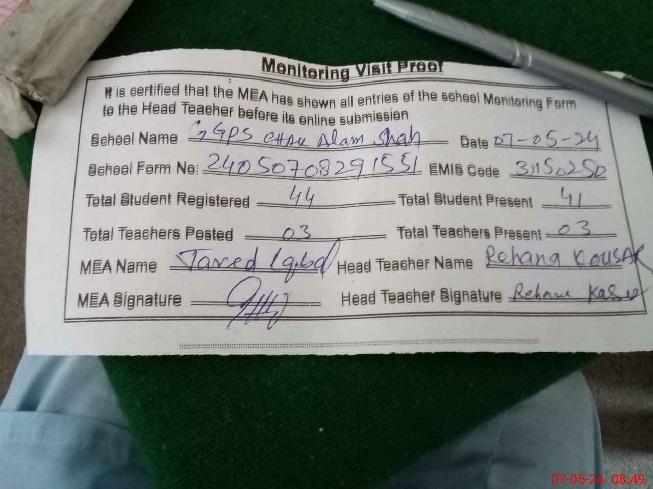 | Attendance Register | Head Teacher | MEA with School | Visit Proof |