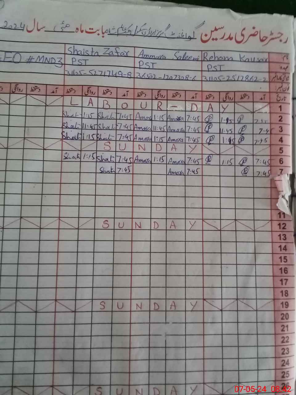 | CNIC | Full Name | Designation | R/C | Absence During Last Calender Month |