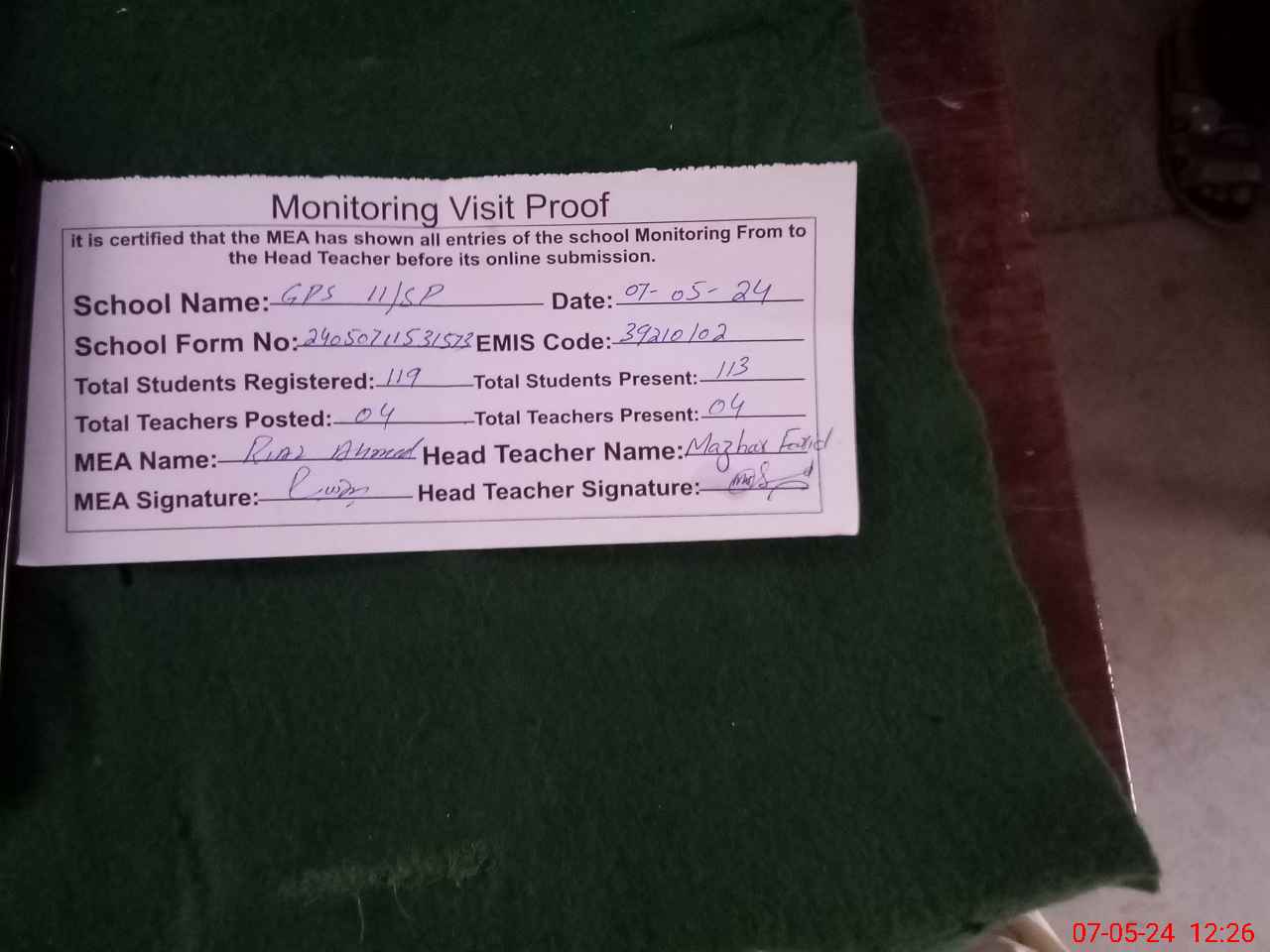 | EMIS Code: 39210102 | Name of School: GPS 11/SP P.O 8/S.P PAKPATTAN | |||