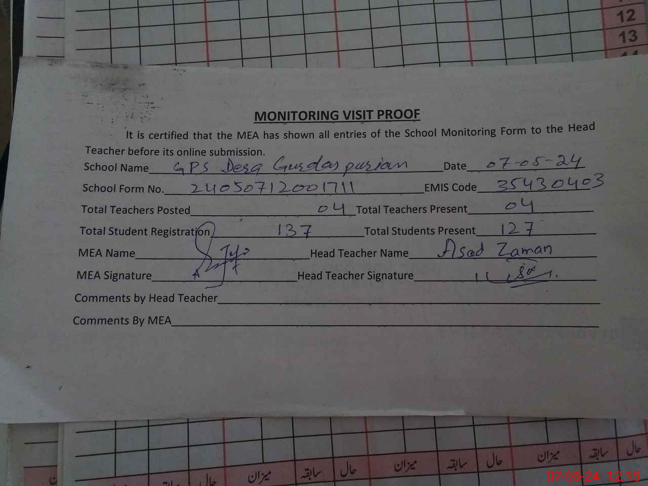 | Attendance Register | Head Teacher | MEA with School | Visit Proof |