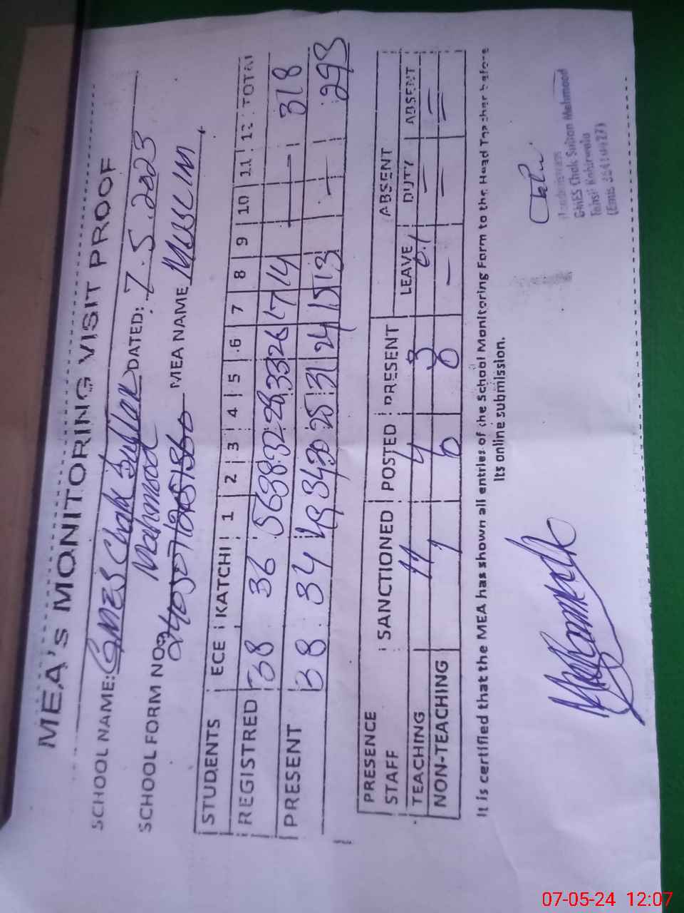 | Certified that this School was Inspected by the Undersigned MEA/DMO Today and the Information Stated Above is as Per Record. | |||||
