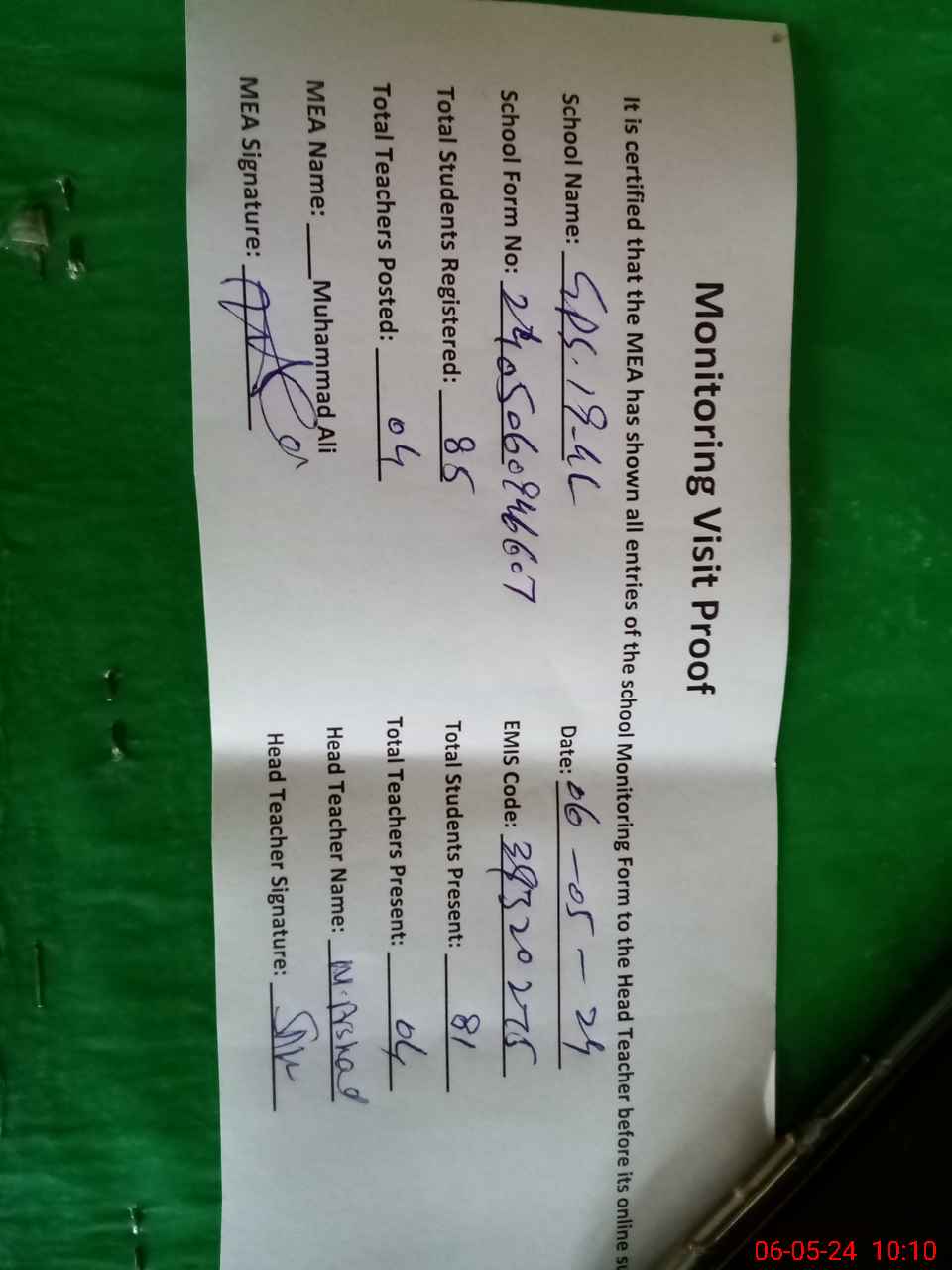 | Attendance Register | Head Teacher | MEA with School | Visit Proof |