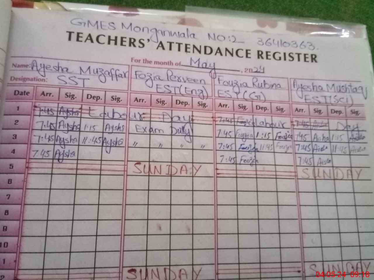 | 36**** | Fo**** Pa**** | EST | Regular | 0 | 0 | 0 | 0 | 0 | 0 | 0 | 0 | 0 | Exam Duty |