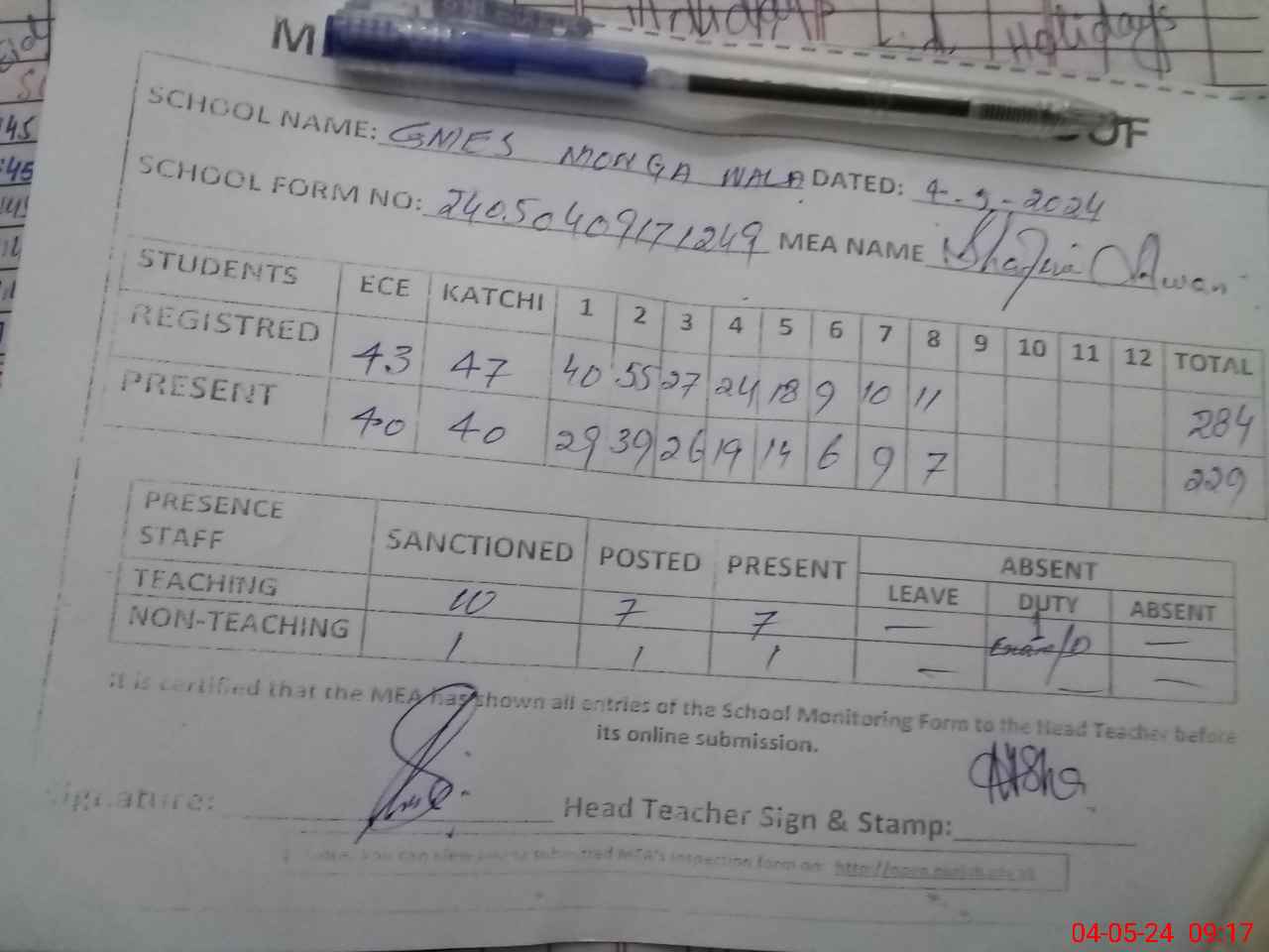| Attendance Register | Head Teacher | MEA with School | Visit Proof |