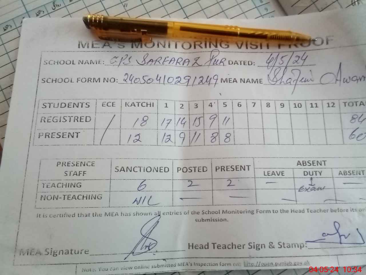 | Attendance Register | Head Teacher | MEA with School | Visit Proof |