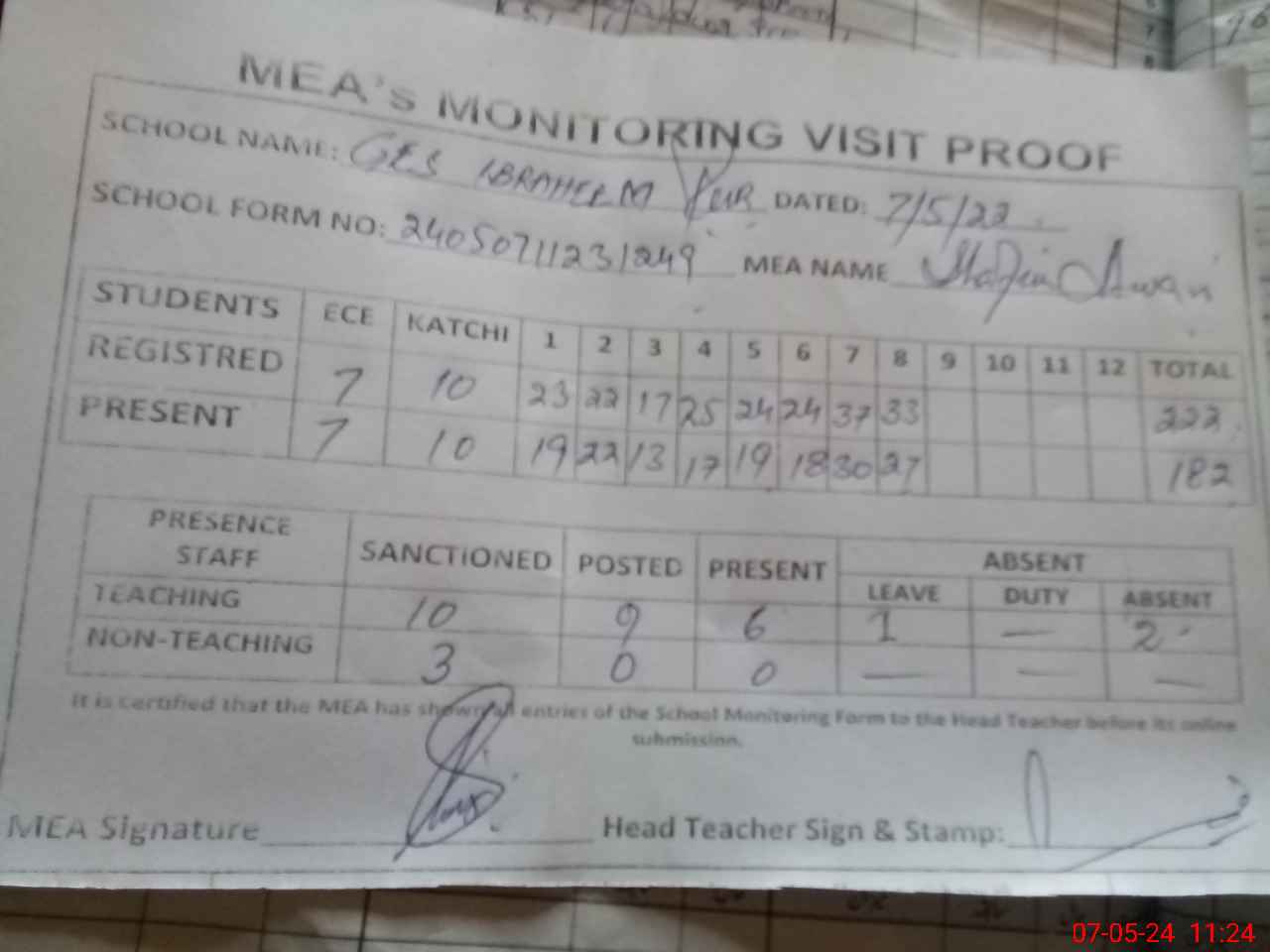 | Attendance Register | Head Teacher | MEA with School | Visit Proof |