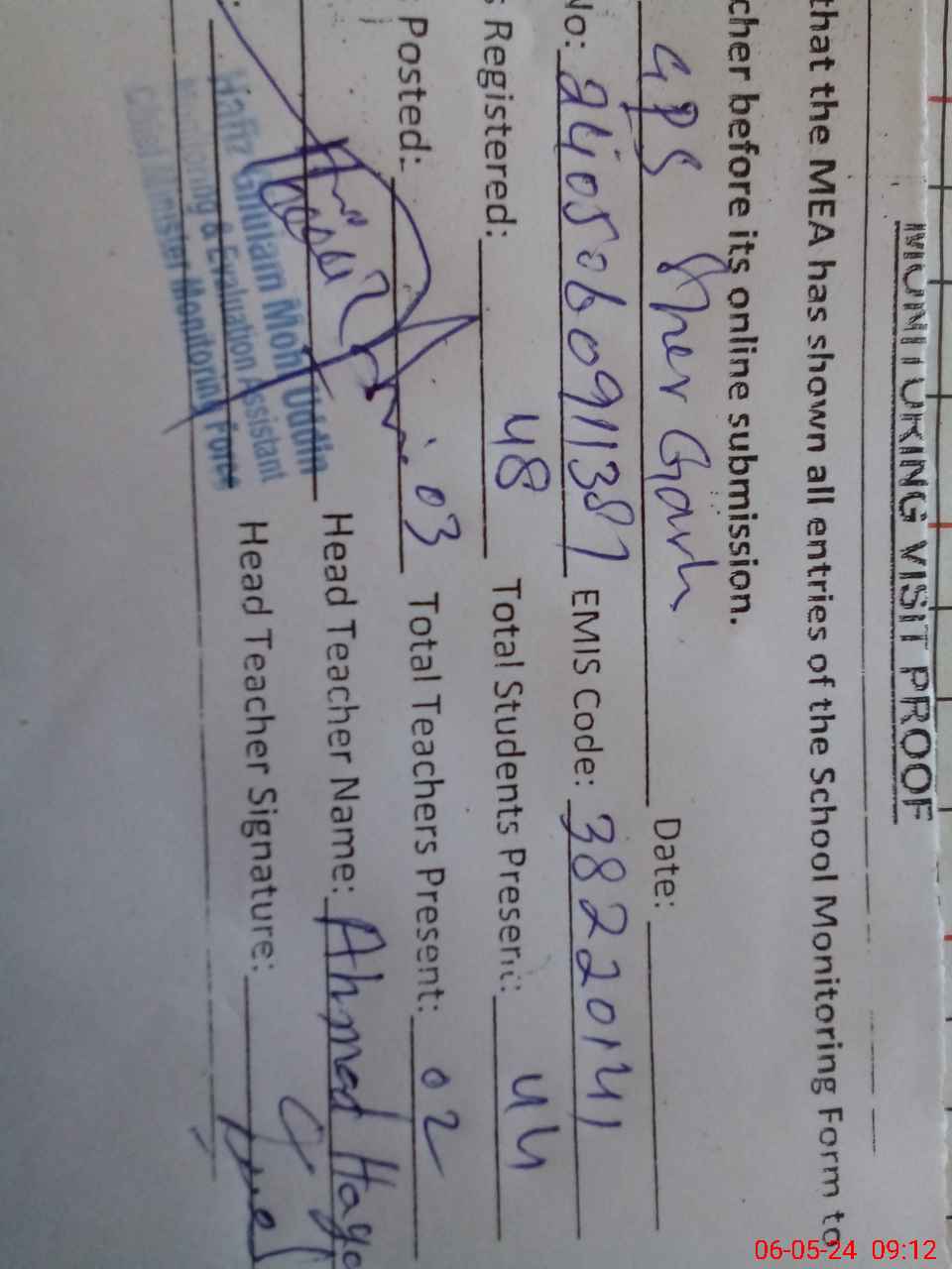 | Attendance Register | Head Teacher | MEA with School | Visit Proof |
