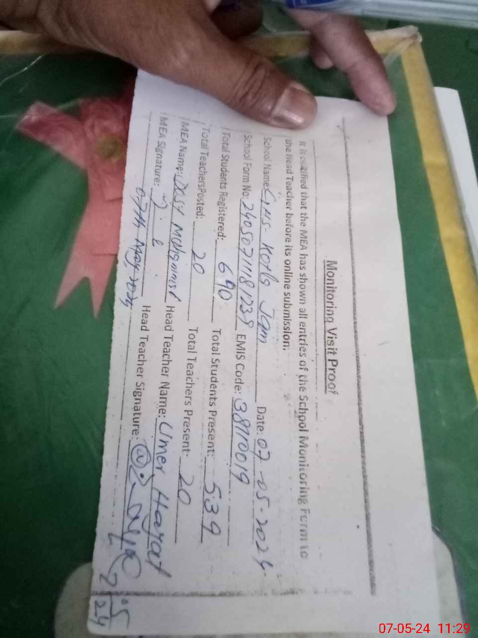 | Attendance Register | Head Teacher | MEA with School | Visit Proof |