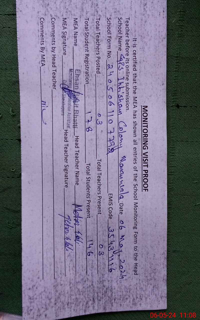 | EMIS Code: 35431116 | Name of School: GPS IHTISHAM COLONY MANANWALA | |||