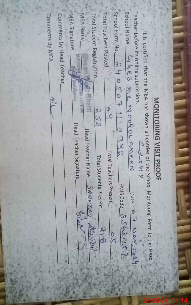 | Certified that this School was Inspected by the Undersigned MEA/DMO Today and the Information Stated Above is as Per Record. | |||||