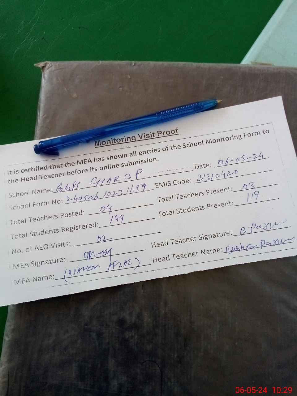 | Attendance Register | Head Teacher | MEA with School | Visit Proof |