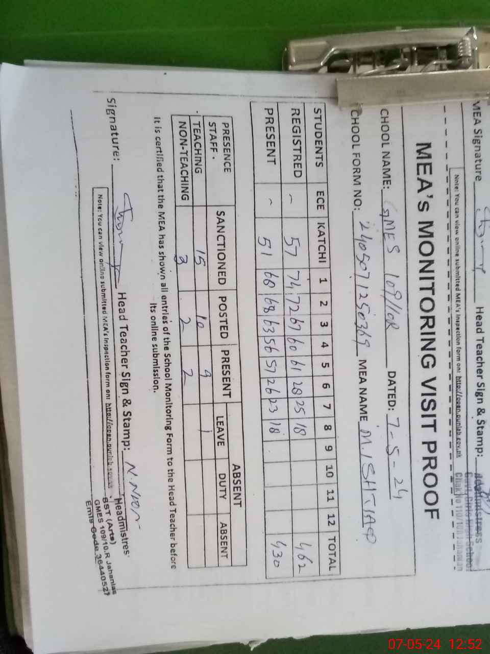 | Attendance Register | Head Teacher | MEA with School | Visit Proof |
