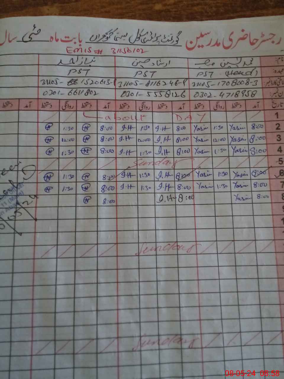 | Name: MYa**** Designation: (School Headmaster's/Headmistress's) PST Phone/Cell Number: 03**** |