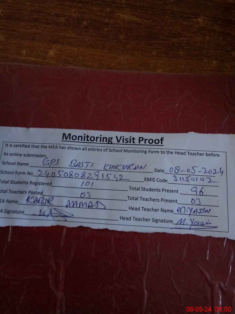 | Attendance Register | Head Teacher | MEA with School | Visit Proof |