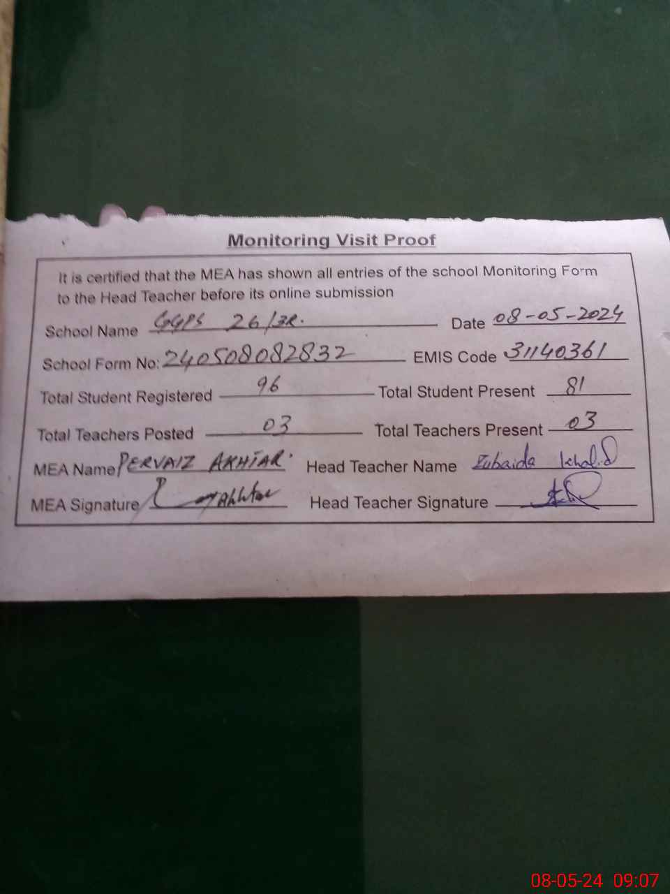 | Attendance Register | Head Teacher | MEA with School | Visit Proof |