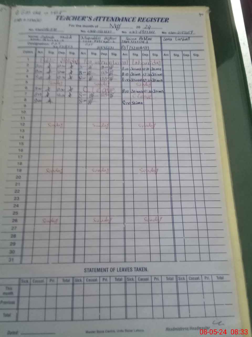 | CNIC | Full Name | Designation | R/C | Absence During Last Calender Month |